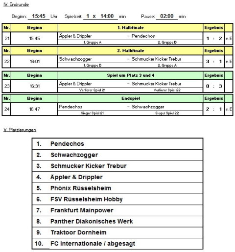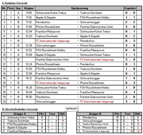 „Traktoor Dornheim“ lud am Samstag dem 5. Juni 2010 zu seinem ersten Turnier ein. An diesem sehr schönen und extrem heißen Tag trafen sich 10 Hobby-Fußballmannschaften um unter sich einen Sieger zu ermitteln. Gespielt wurden 14min. pro Spiel. Die angetretenen Mannschaften waren: